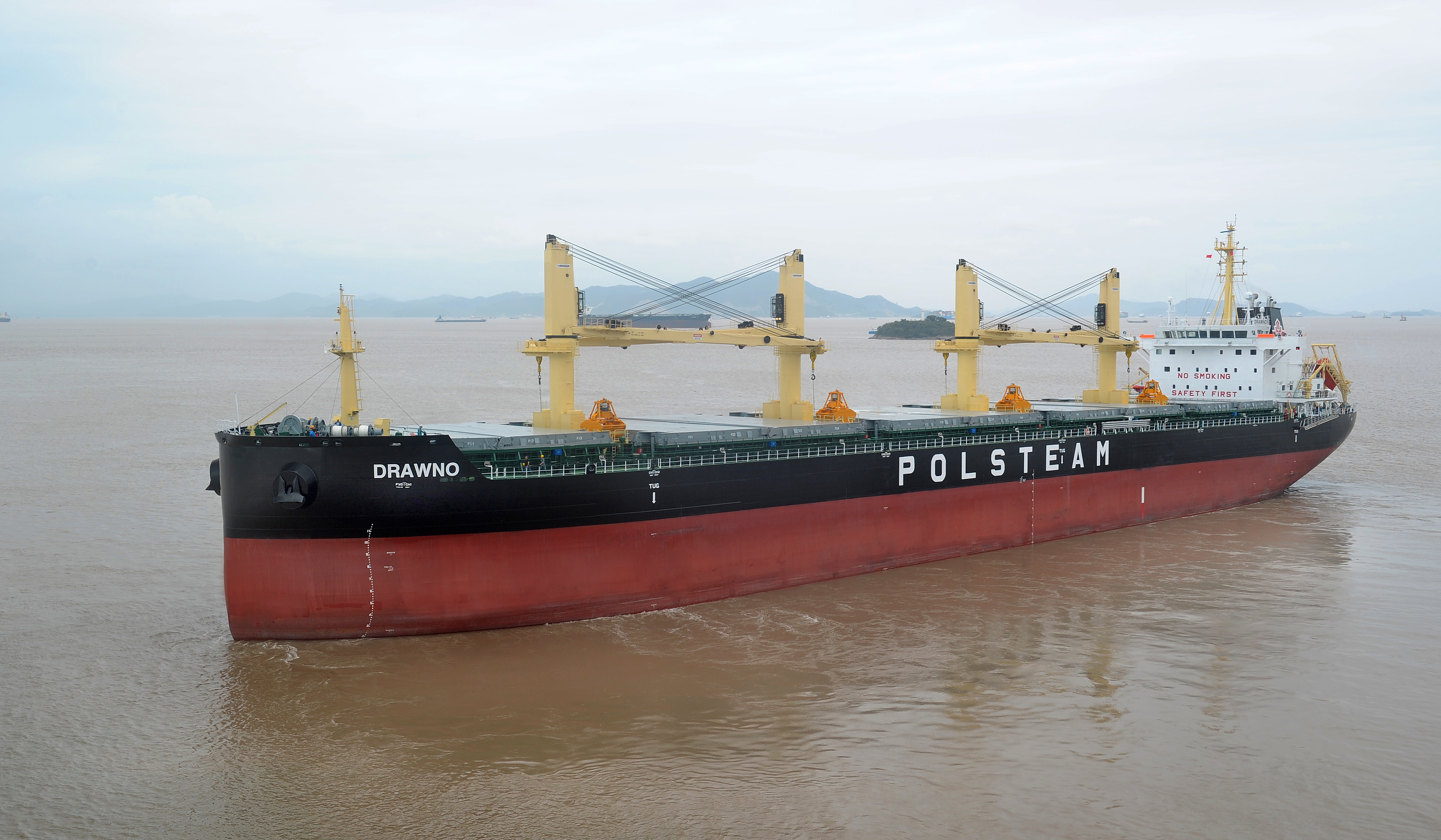 2018年9月7日,揚帆集團為波蘭船東建造的38520DWT系列散貨船“DRA WNO”正式簽字。該船型總長179.99m,型寬30.00m,型深15.00m,保證航速13.59kn,保證燃油消耗160.3gkwh。該船型是揚帆集團自行設計的經濟節(jié)能、綠色環(huán)保型散貨船,大開口的雙殼設計,尾部左舷裝有一個鰭,船舵上帶舵球,起到降能增效作用。
