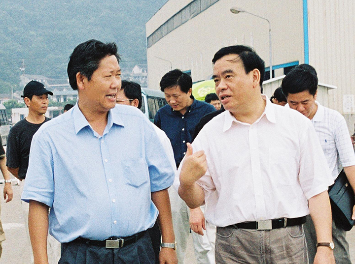 2003年8月8日,浙江省委副書記、省長呂祖善(右一)來“揚帆”視察,要求揚帆集團依托舟山的港口和區(qū)位優(yōu)勢,拓展發(fā)展思路,創(chuàng)新管理機制,抓住船舶工業(yè)發(fā)展的有利機遇,進一步做大做強。