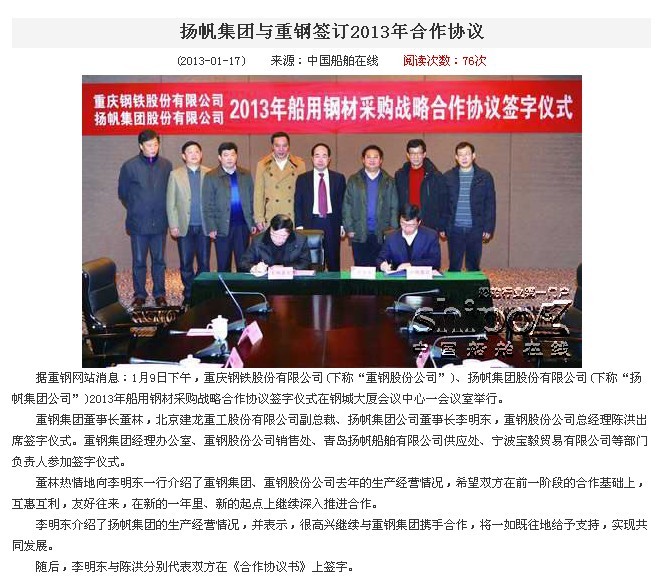 中國船舶在線:揚帆集團與重鋼簽訂2013年合作協(xié)